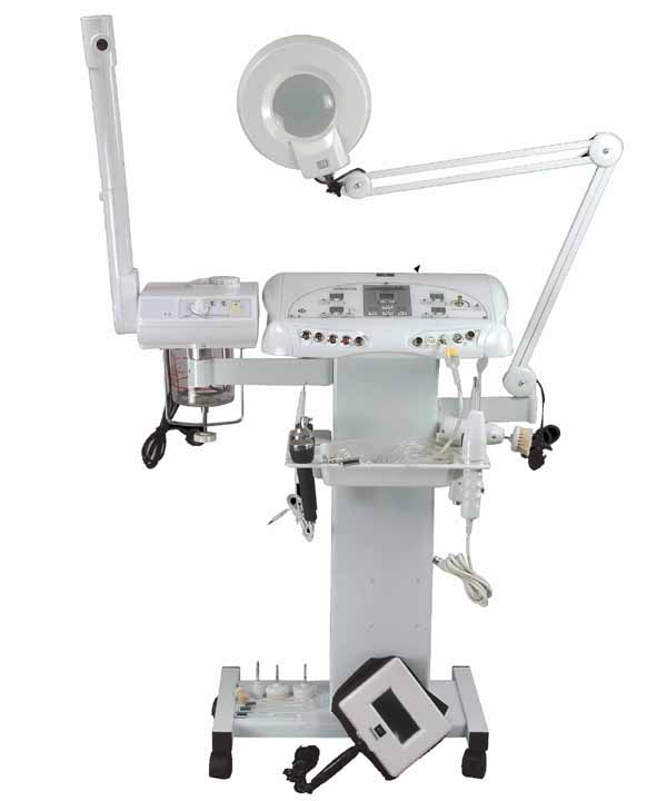 The 11 in 1 Skin Care System multi-function electrical unit is a must for effective, focused facial and body treatments. The variable functions of the unit can be used to address specific concerns including exfoliation, wrinkle management, hydration, collagen/ elastin stimulation, and firming. Classic, non-invasive esthetic equipment for measurable results! The functions included with this machine are the Vacuum, Brush, Spray, Steamer, Galvanic, High Frequency, Mag Lamp and Wood’s Lamp. This unit is perfect for any professional! Features: 10 in 1 Professional Skin Care Machine A Must for effective, focused facial and body treatments Wheels make this unit easy to move around any Treatment Room Functions Include: Vacuum, Brush, Spray, Steamer, Galvanic, High Frequency, Mag Lamp, and Wood’s Lamp